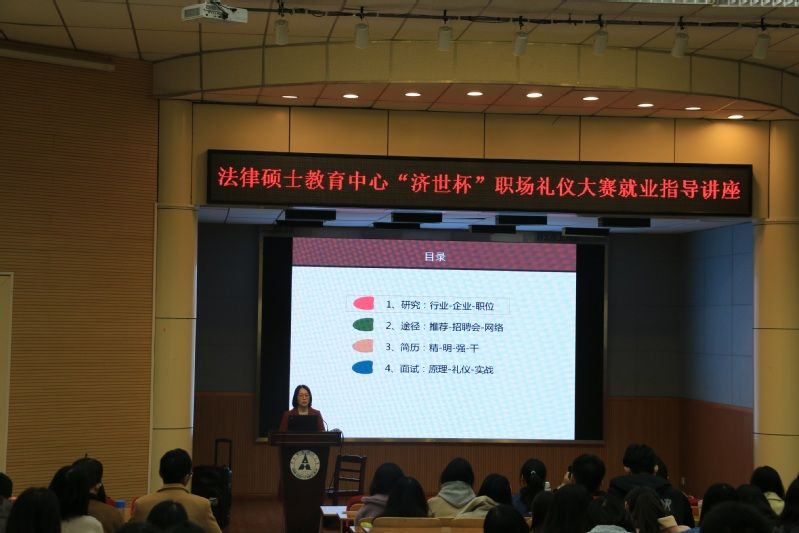 (通讯员 余昌隆 摄影 余昌隆)2018年11月19日-22日,法律硕士教育中心举办了2018年“济世杯”职场礼仪大赛就业系列讲座。本次系列讲座共有两场,分别邀请了校就业指导服务中心兰玉娟老师和心理健康教育咨询中心余金聪老师作讲座,2017级和2018级学生参加了本次系列讲座。