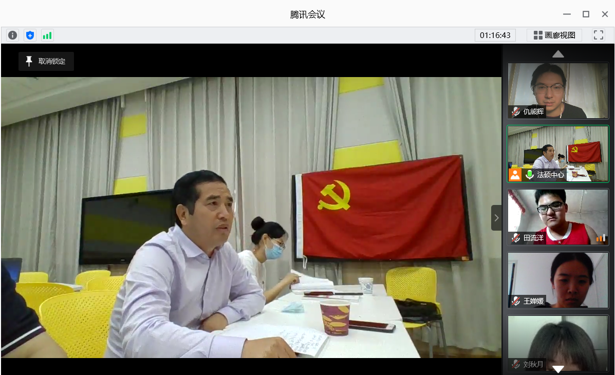 陈金川同志谈到,近年来,法硕中心学生党总支党建工作成果显著,于2019年底入选全国第二批高校党建工作样板党支部,希望在今后的工作中能够继续发扬光大,再创佳绩。希望法硕同学在家学习顺利,早日成长成才。