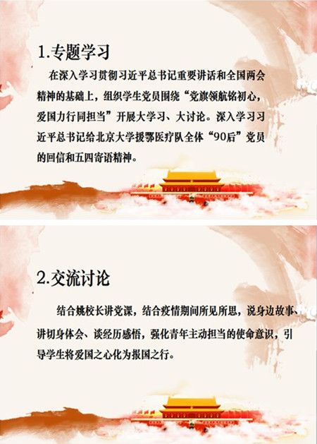刘胜波同志表示,微党课讲解深入浅出,教导语重心长,同学们高扬爱国主义旗帜,结合各自社会实践也进行了很好的交流,并向学校和各位领导老师表达谢意、向同学们表达祝愿。他表示,今后会持续关注高校党组织战疫示范微党课这一专题活动,持续关注我校在党建方面的优秀经验和做法,及时总结、挖掘、宣传、推广。