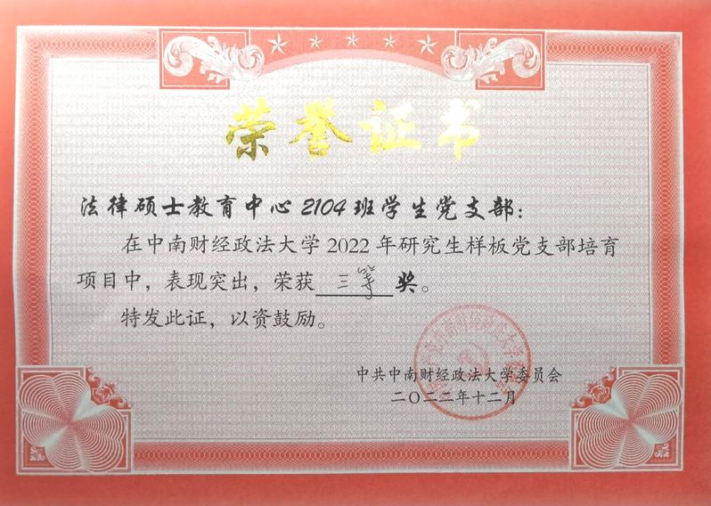 (通讯员 余安琪 学生通讯员 郑合慧灵)2022年12月,法硕2104、2105班学生党支部顺利通过校党委组织部、党委研究生工作部2022年“不忘初心跟党走·青春筑梦新时代”研究生样板党支部培育项目的结项验收。其中,法硕2104班学生党支部于同月的“2022年研究生样板党支部培育项目成果展评会”中荣获三等奖。