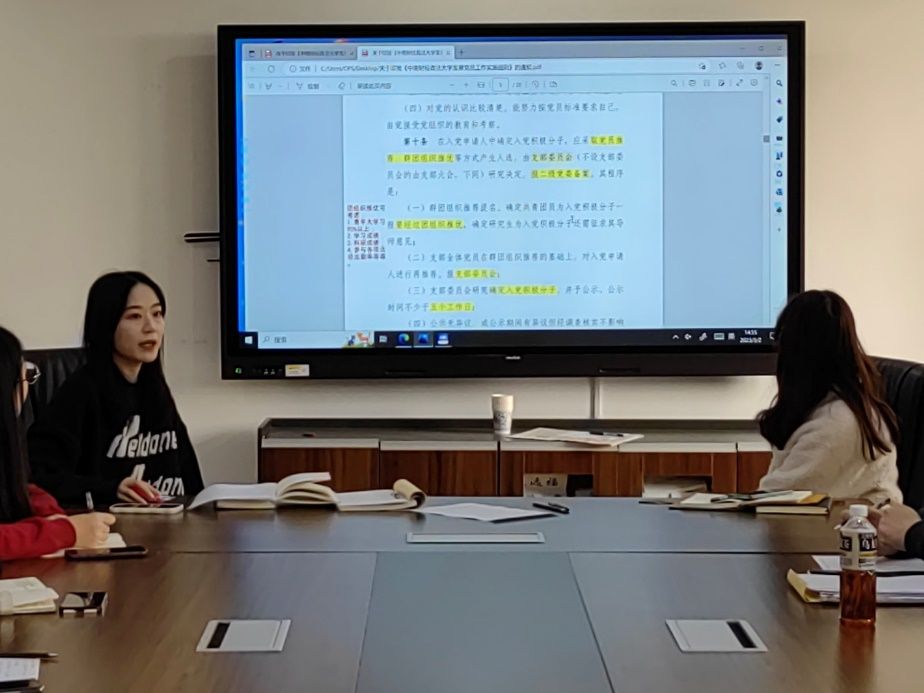 余安琪对党员发展的相关流程进行讲解。她根据《中国共产党发展党员工作流程图》以及《星空彩票网络彩票App发展党员工作实施细则》,详细讲解了发展党员的每个步骤,对入党申请人初步培养阶段、入党积极分子的确定和培养、发展对象的确定和考察、预备党员的接收、培养教育、考察和转正等阶段需要注意的情况进行说明;着重强调了发展党员工作的规范性和严肃性,要高度重视对相关材料的审核和撰写。
