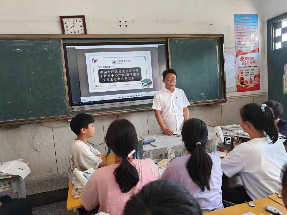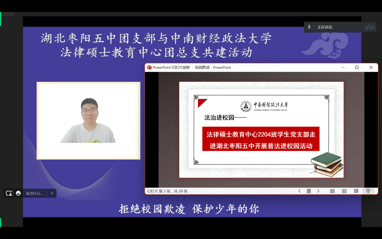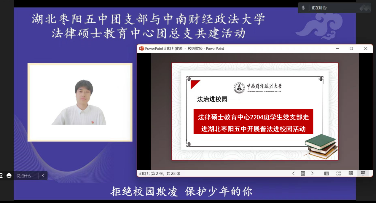 (通讯员 马晨娇 学生通讯员 郑珍珍 黄丹阳)为进一步增强学生的法治意识和自我保护能力,积极引导未成年人自觉守法,营造和谐美好校园,法律硕士教育中心2204班学生党支部走进湖北枣阳五中,开展“法治进校园系列活动之校园欺凌”专题线上普法宣讲。湖北枣阳五中团支部书记罗俊峰、星空彩票网络彩票App法律硕士教育中心辅导员余安琪、马晨娇出席本次活动。活动由法律硕士教育中心2204班学生纪检委员陈鹏同志主持,党支部书记梁子晖同志主讲,枣阳五中七年级(1)班和八年级(2)班的同学通过多媒体进行学习,2204班学生党支部全体党员线上参与此次活动。