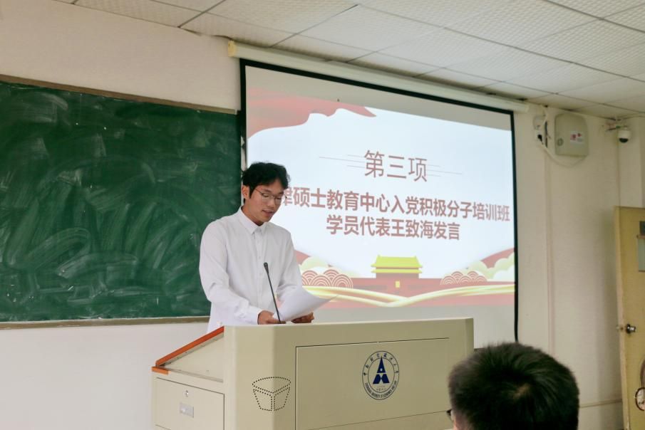 仪式第三项,培训班学员代表王致海同学发言。他提出加入中国共产党是一种信仰,青年一代应当接过时代火炬,不忘初心,为实现共产主义事业而奋斗。青年研究生应自觉做到厚植爱国情怀,要突出“敢担当”的时代要求,勇当先锋、勇挑重担,在党和人民最需要的时刻冲得出来、顶得上去,在亲身奋斗实践中坚定理想信念。