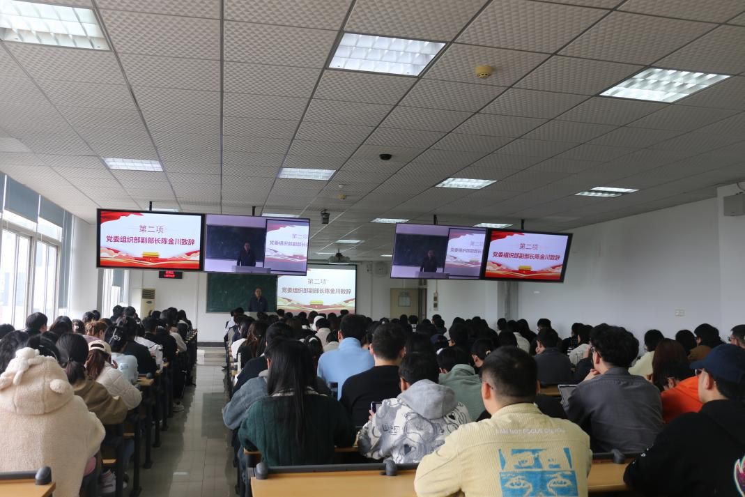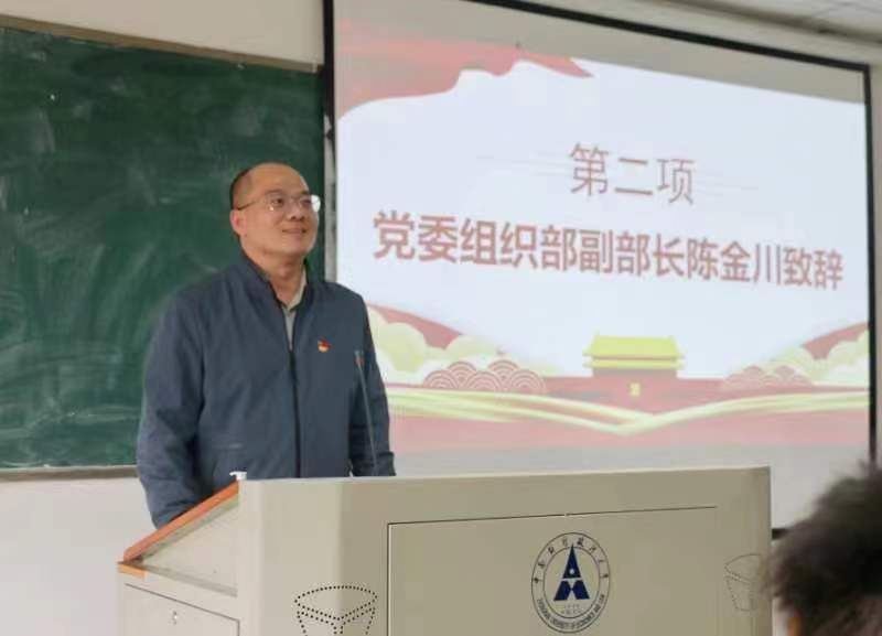仪式第二项,陈金川老师致辞。首先,他强调了发展党员工作要坚持标准、保证质量、改善结构、慎重发展。其次,他提出两点认识:一是要进一步提高发展党员的工作站位,要源源不断地将优秀的青年学生吸收到党内。二是广大学子要端正入党动机,要加强对自身学习、社会实践、服务意识等方面的要求。最后,他提出要把党员培养与人才培养相结合,党性教育与能力培育的结合,党校的培养教育与党史学习教育、思想政治理论课学习实践相结合。各位法硕学子要持续提高政治素养,系统掌握专业知识,努力成为德智体美劳全面发展的时代新人,努力成为祖国建设的栋梁之材。