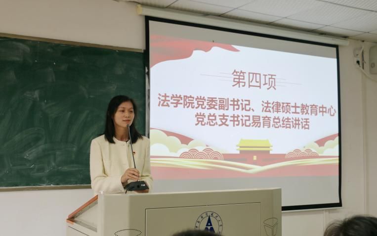 仪式第四项,易育书记总结讲话。她首先代表法律硕士教育中心学生党总支向广大入党积极分子表示衷心的欢迎和祝贺。之后她提出了本次培训的三个目标:一是系统学习党的基础知识,党的基础知识是每一位入党积极分子必须掌握的知识,通过培训从思想上解决入党问题。二是端正入党动机,入党动机决定入党后表现,入党动机纯正入党就会成为新的起点。三是深入理解党员标准,要求大家掌握党员标准的由来、含义、属性和内容,自觉用党员标准严格要求自己,对照党员标准结合自己的思想实际查找差距,明确努力的方向,制定前进规划,以自己实际行动争取早日加入党组织。