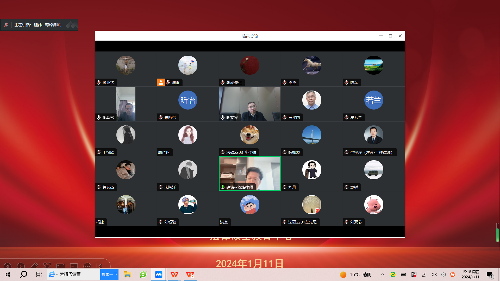 (通讯员 周诗琪 陈璇 学生通讯员 黄文杰 米亚铭)为深入贯彻落实习近平总书记关于研究生教育工作的重要指示和教育部《关于深入推进学术学位与专业学位研究生教育分类发展的意见》文件精神,落实“双导师制”,全面提升法律硕士拔尖创新人才自主培养质量,法律硕士教育中心于1月11日下午采用线上腾讯会议的方式召开第七场“合作导师回校领航计划”工程建设法律与实务方向专场合作导师与研究生见面会。法律硕士教育中心主任简基松,副主任王广波,教学秘书杨捷、陈璇,2023级专职辅导员周诗琪,上海建纬(武汉)律师事务所主任张志文、行政总监张海涛,上海市建纬(南京)律师事务所主任孙宁连,上海市建纬律师事务所副主任韩如波、宋仲春,合伙人陈军、蒋烽、刘畅,中铁大桥局集团有限公司调研员、原总法律顾问马建国,法律合规部部长胡文锋,中国能源建设集团有限公司总经理秦铁平,中冶南方工程技术有限公司法律事务部部长郑洁,武汉城市建设集团有限公司总法律顾问李芊,北京德和衡律师事务所集团副总裁马丽红等参加本次见面会。会议由王广波主持。