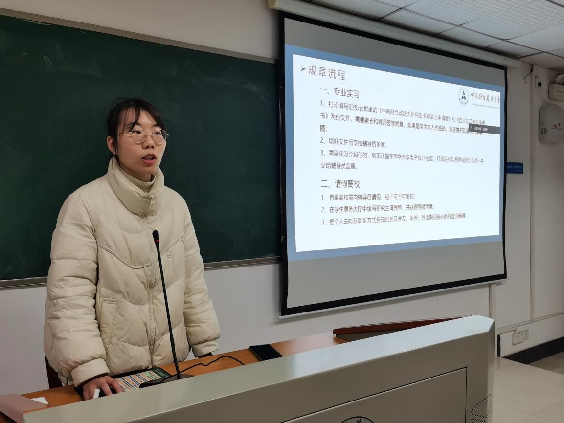 (通讯员 马晨娇 郑珍珍 摄影 陈鹏)为积极引导学生开展学业生涯规划,更快适应新学期生活,明确未来努力方向,强化学生安全教育,3月4日,法律硕士教育中心2022级组织开展了新学期班会,会议由辅导员马晨娇主持,以线下线上相结合的方式展开,2022级全体学生参加此次班会。