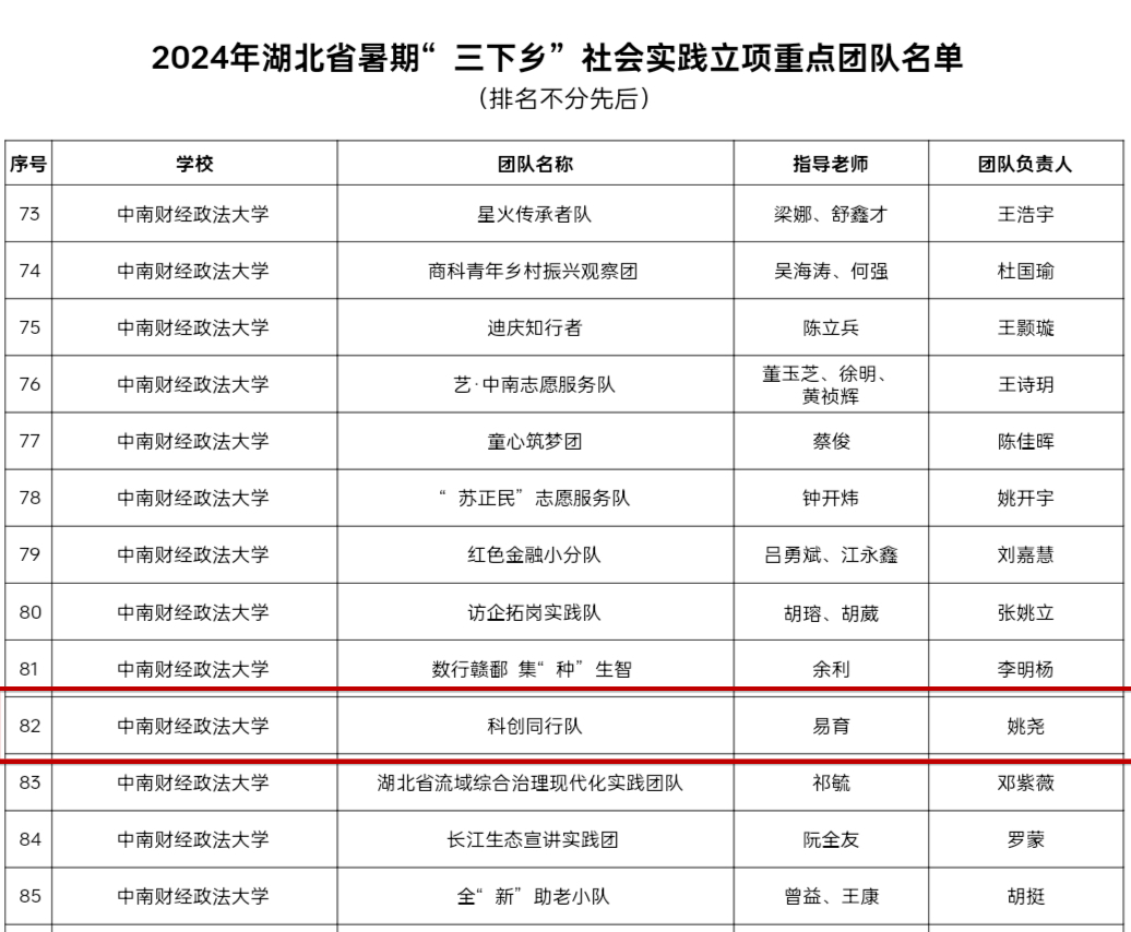 近日,湖北省暑期“三下乡”社会实践立项重点团队名单公布,我校法律硕士教育中心的科创同行实践队在来自94所高校的1032支队伍中脱颖而出,成功入选。