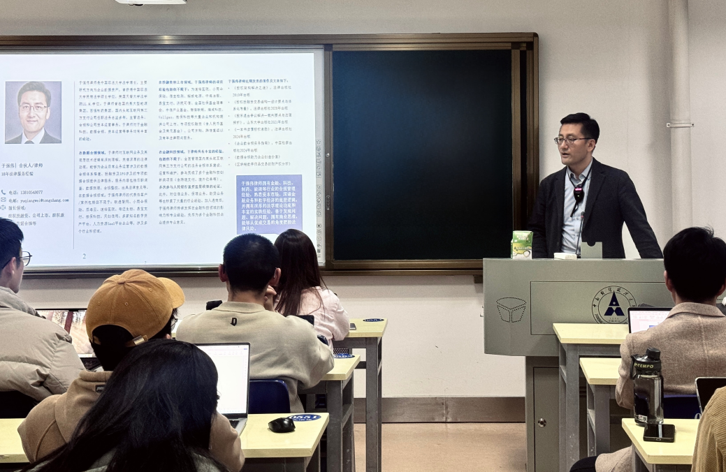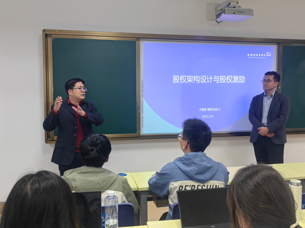 (通讯 周诗琪 陈知)为全面贯彻习近平总书记关于研究生教育工作的重要论述精神,立足实践导向深化人才培养模式创新,持续推动产学研协同育人体系建设,以高质量法治人才培养服务新时代发展需求,星空彩票网络彩票App法律硕士教育中心于2025年3月20日晚在文澴楼123教室开展星空娱乐麻将APP论坛“实务导师进课堂”2025年第二期讲座。北京市通商律师事务所合伙人、中国政法大学民商法学博士于强伟担任主讲嘉宾,围绕“股权架构设计与股权激励”主题展开深度讲解。法学院商法教研室徐强胜教授、旷涵潇老师,法律硕士教育中心王广波副主任,以及我校研究生和本科生共计五十余人参加本次讲座。